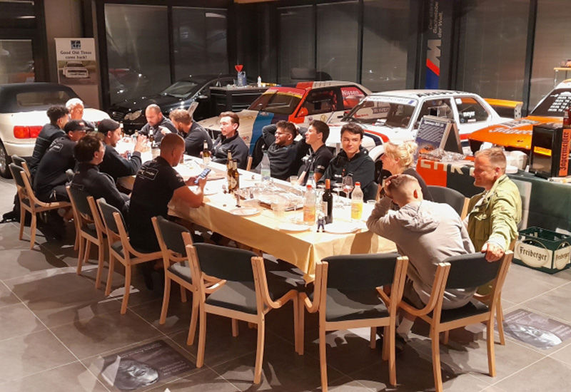 Hier kann man konzentriert tagen und sich zwischendurch in dem historischen Ambiente klassischer Fahrzeuge entspannen, um neue Energie zu tanken. In der angeschlossenen Werkstatt riecht es nach Arbeit, halbierte Karossen, zerlegte Motoren – ein beeindruckendes Erlebnis.